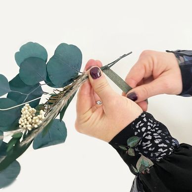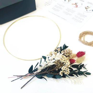 Gather materials such as a hoop, dried foliage, floristry tape, wire and and cutters. For the easier option, buy one of our ready made dried flower wreath kits
